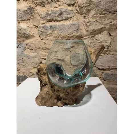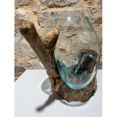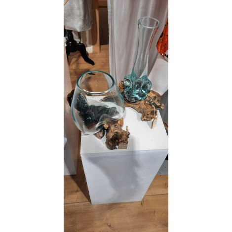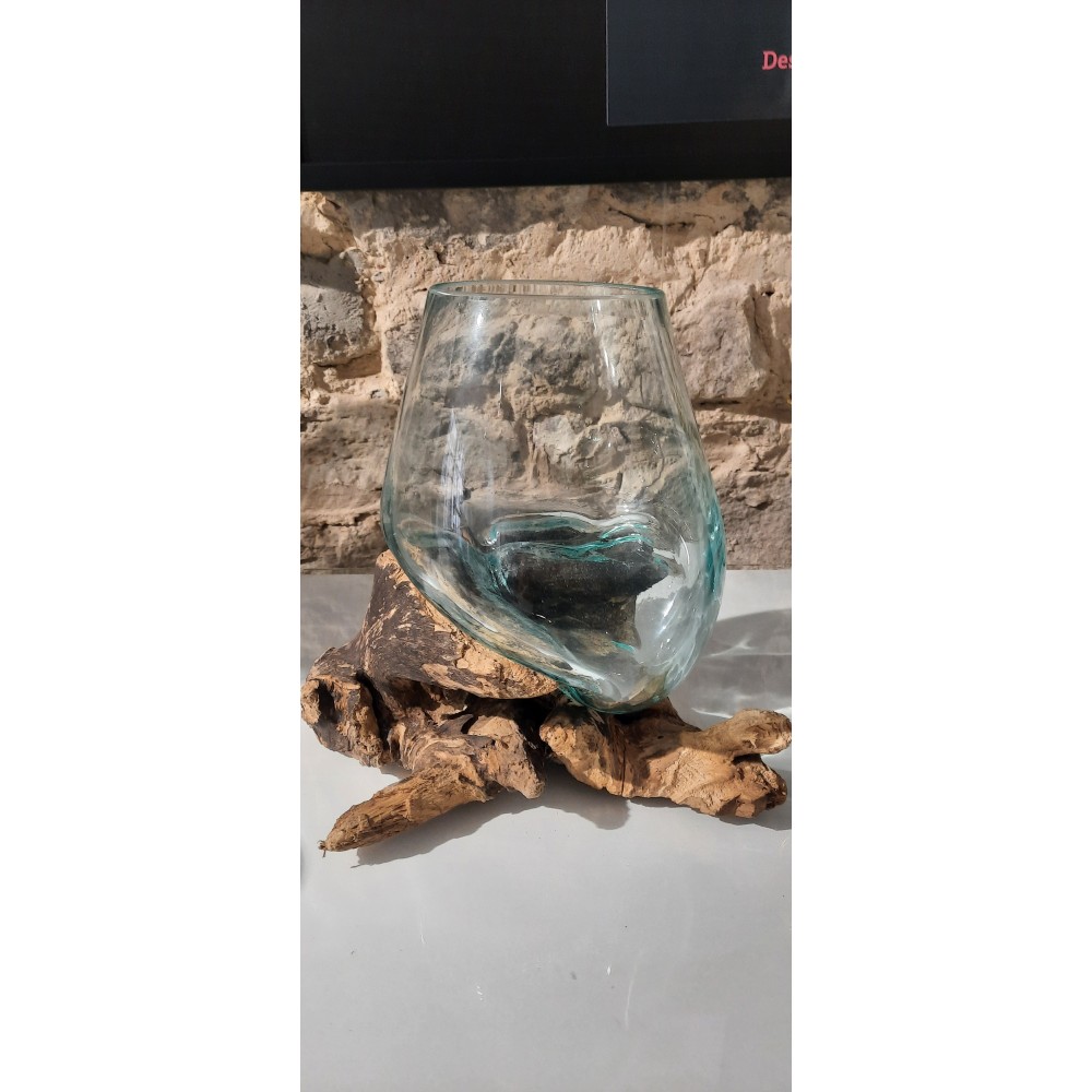 Vase en verre soufflé moulé sur une racine de teck