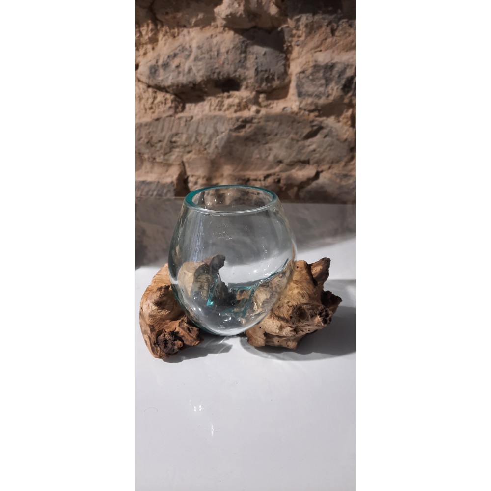 Vase globe en verre soufflé moulé sur une racine de teck format S